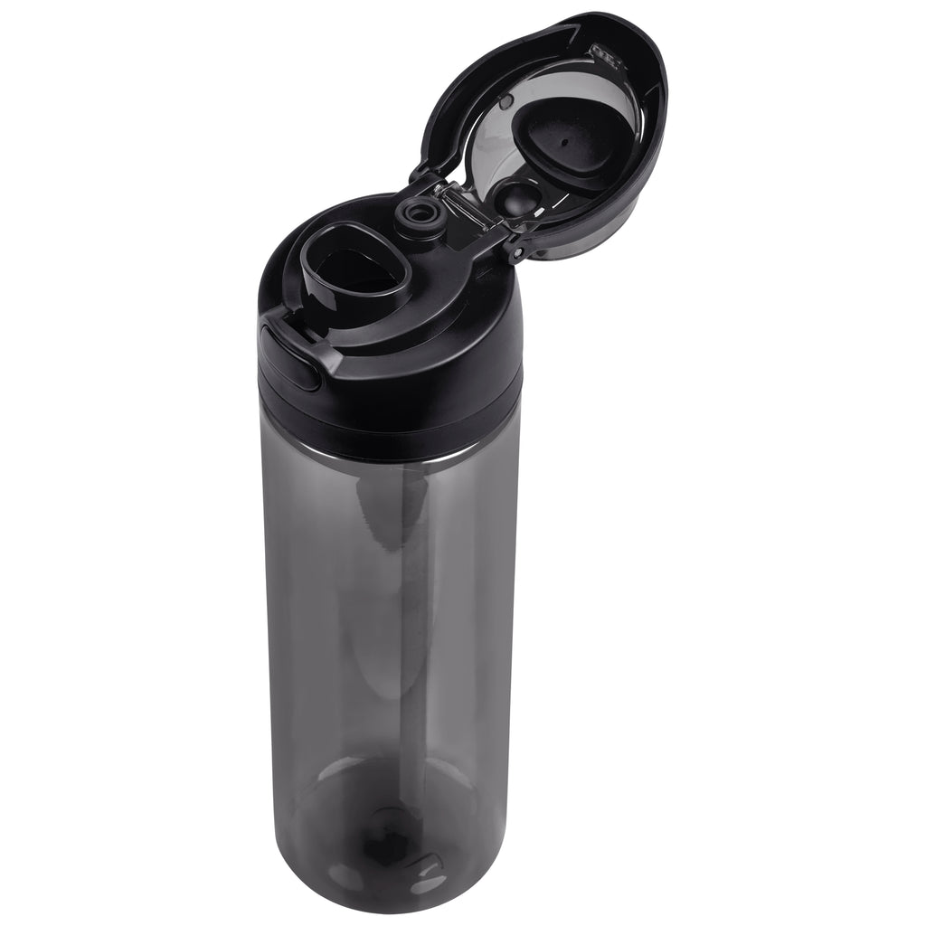 The innovative swig or sip lid design of this sporty water bottle gives you two drinking options: hold it upright to sip through the built-in flip straw, or tilt back to swig through the drinking port opening. Use the push-button to pop the lid open and enter one-handed swig mode. It’s equipped with a built-in handle that can be flipped up for easy carrying and flipped down to lock the push-button. The lid also has a clip-lock mechanism to keep it watertight when not in use, but easy to pop open when you need to hydrate. Unscrewing the lid from the base reveals a wide mouth, which makes it easy to load ice or fruit into your water. The bottle base is made from clean, BPA-free recycled PET plastic.